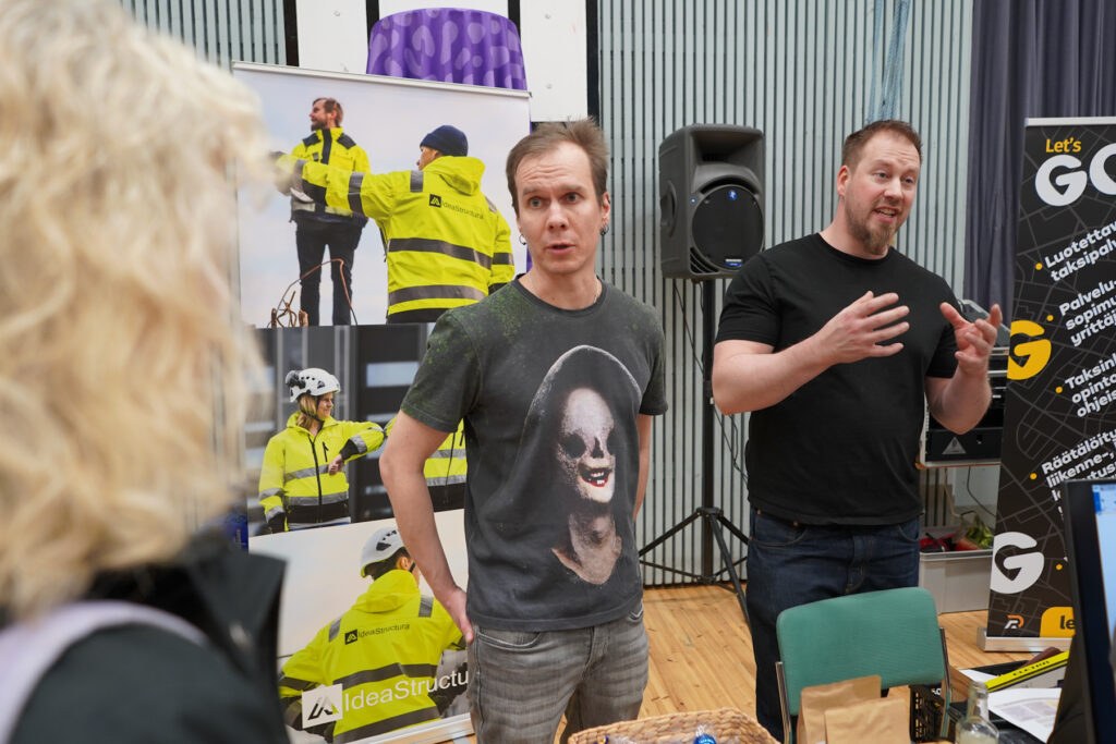 IdeaStructura Oy:n Kari Kosonen ja Jyri Pitkänen rekrysivät insinööriopiskelijoita rakennesuunnittelun töihin. Messuilla yritys saa myös toivomaansa näkyvyyttä.